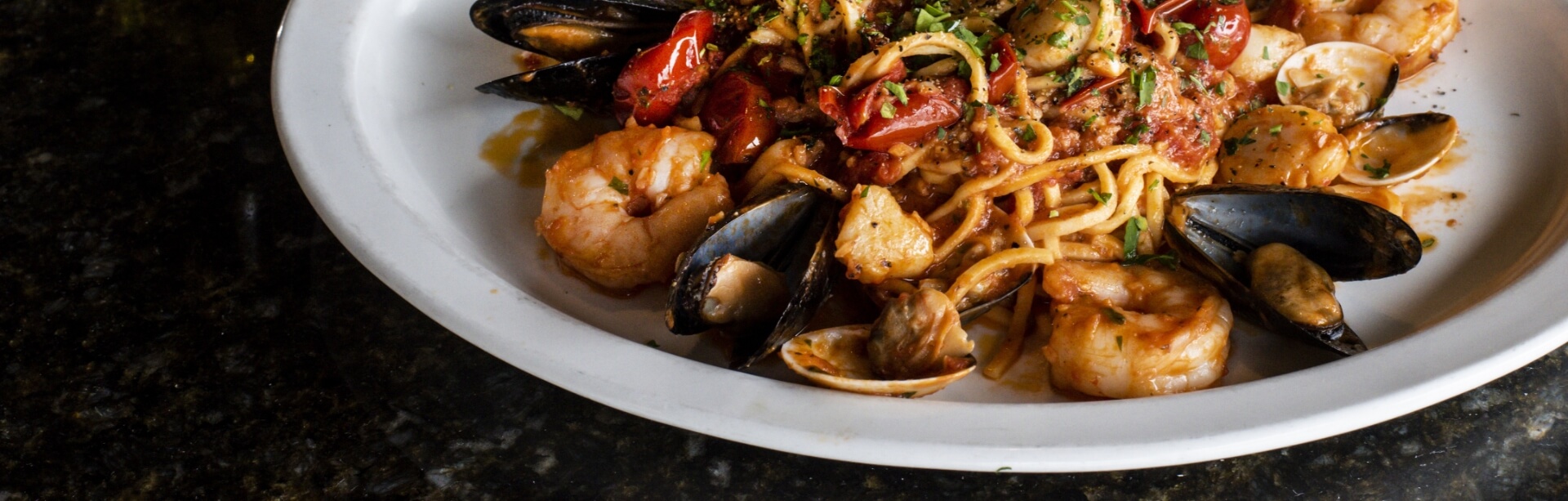Mussels, clams, bay scallops, shrimp, slightly spicy cherry tomato sauce, garlic, parsley